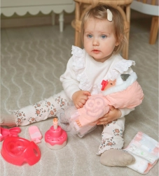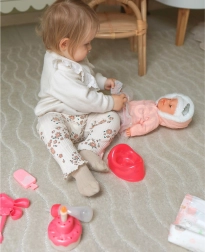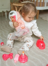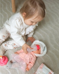 De pop kan uit een flesje drinken en je kunt haar voeren met het bijgeleverde schaaltje. Vadertje-en-moedertje spelen stimuleert empathie en verantwoordelijkheid.