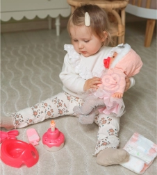 - Rijke uitrusting – kleertjes, luier, flesje, schaaltje, speen en verjaardagstaart met geluid.