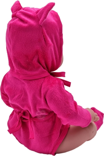 De pop draagt een schattige roze outfit met beerdesign en capuchon, wat een speelse en aantrekkelijke uitstraling geeft.