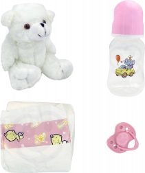 In de doos vind je: een flesje, fopspeen, wegwerpluier en een schattige knuffel – alles wat een kind nodig heeft voor zorgscenario’s en om verantwoordelijkheid te ontwikkelen.