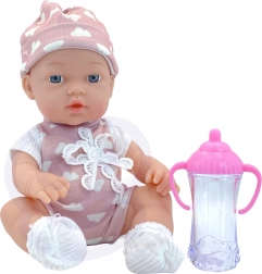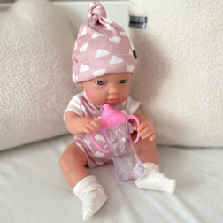 De pop heeft zachte, rubberen handen en voeten en een stevig plastic lijfje zonder pluche vulling, wat zorgt voor duurzaamheid en eenvoudig onderhoud. In de verpakking vind je ook een roze flesje dat de pop in haar handjes kan houden – perfect voor voedingsspel.