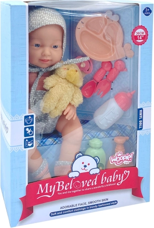 De set bevat alles wat kleine verzorgers nodig hebben: een aangeklede pop, fopspeen, teddybeer, flesje en een eetset (bordje, vorkje, lepeltje), aangevuld met twee flesjes “cosmetica” voor bad- en verzorgingsscenario’s. De pop heeft zachte, rubberen bewegende ledematen en een kunststof lijfje zonder pluche vulling.