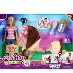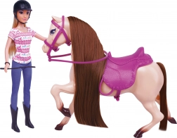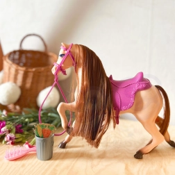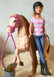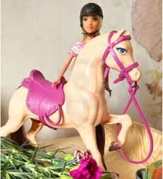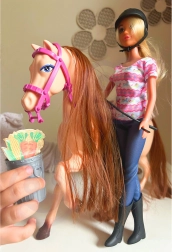 De pop en het paard hebben lang, dik haar dat onbeperkte mogelijkheden biedt voor het maken van kapsels en styling.