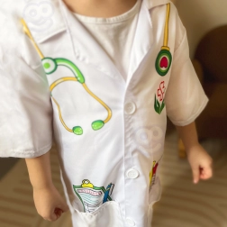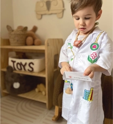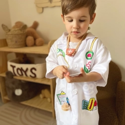 Dit nauwkeurig afgewerkte dokterskostuum van Woopie biedt jonge medicijnliefhebbers perfecte uitrusting voor hun fantasierijke spel. Het bevat kleurrijke prints van instrumenten zoals een stethoscoop, medicijnen en een thermometer. Met zijn ruime zakken is het ideaal voor het opbergen van andere speelgoederen.