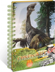- 12 fluwelen kleurplaten, 5 mini stiften, instructies, informatieve pagina’s over dinosaurussen