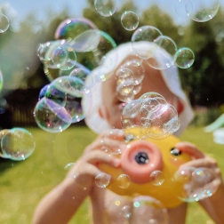 De geïntegreerde ventilator blaast de bellen verder weg en vergroot het effect. Ideaal voor buitenspelen in de zon.