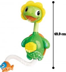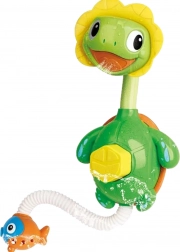 Ontdek een speels badspeeltje dat van de dagelijkse wasbeurt een vrolijke show maakt. Na het indrukken van het buikje stroomt het water naar het hoofdje en spuit het eruit als een douche uit het gezicht van het schildpadje. Dankzij de veerkrachtige slang met visje kunnen kinderen de waterstraal makkelijk bedienen en richten waar ze maar willen.