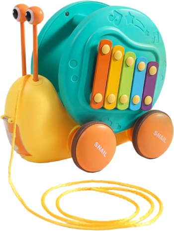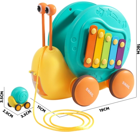 Deze multifunctionele slak van het merk WOOPIE springt meteen in het oog bij kinderen. De kleurrijke schelp dient als xylofoon met toetsen waarop getikt kan worden met de uitneembare “oogjes” – de stokjes. Dankzij het stevige koord kunnen kinderen de slak trekken en duwen, waardoor oog-handcoördinatie en balans zich ontwikkelen. Op de rug zit een knop die de lanceerbaan opent voor het kleine auto-slakje en zorgt voor talloze vrolijke momenten.