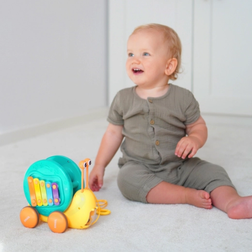 Het stevige koord maakt het mogelijk de slak te trekken, de wieltjes zorgen voor een soepele beweging. Ondersteunt natuurlijke beweging en zelfstandig spel.
