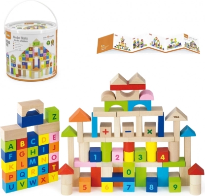VIGA houten blokken 100 stuks met letters en cijfers. Veilig, kleurrijk, in een emmer met handgreep. Ondersteunt motoriek, logica en het leren van alfabet en tellen.