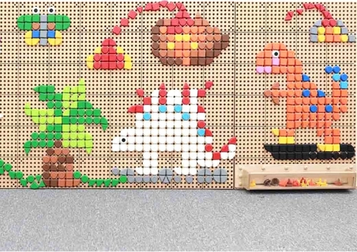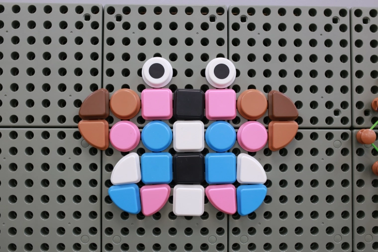 Kleurrijke set geometrische pinnen die eenvoudig op speciale STEM-borden kunnen worden bevestigd. Dit speelgoed stimuleert de creativiteit en fantasie van kinderen bij het maken van eigen afbeeldingen en patronen.