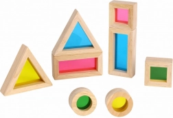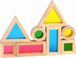 De set bevat rechthoekige, vierkante, ronde en driehoekige blokken die kinderen stimuleren tot leren en spelen.