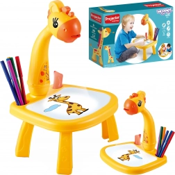 De projectietekentafel in giraffevorm projecteert kleurrijke motieven rechtstreeks op het tafelblad of op het ingelegde papier. Kinderen kiezen een motief, zetten de projector aan en trekken de contouren eenvoudig over – stap voor stap leren ze tekenen. Het oppervlak is droog uitwisbaar, zodat je tekeningen met het meegeleverde sponsje kunt wissen en steeds opnieuw kunt beginnen.
