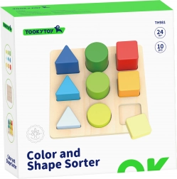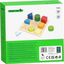 De houten puzzel van TOOKY TOY leert kinderen vormen en kleuren herkennen en ontwikkelt de fijne motoriek, het logisch denken en de oog-handcoördinatie. Het kind plaatst 9 gekleurde stukjes – driehoeken, vierkanten en cirkels – in de juiste openingen in het bord. Geweldig plezier en training van geheugen en concentratie voor de allerkleinsten.