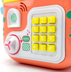 Bewaar munten en bankbiljetten via afzonderlijke openingen, stel een wachtwoord in en open met de draaiknop. Ideaal voor de eerste stappen naar financiële geletterdheid.