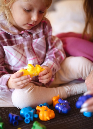 De afbeelding toont kleurrijk plastic speelgoed in de vorm van eenhoorns, bedoeld voor verbinding en het bouwen van vormen. Ze helpen bij de ontwikkeling van motorische vaardigheden en creativiteit bij kinderen.