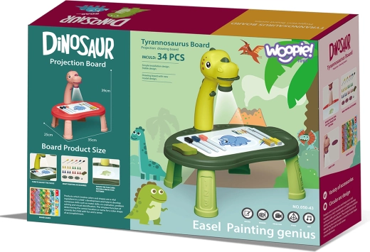 Maak leren tekenen leuk. Het dinosaurus projectietafeltje WOOPIE laat kinderen comfortabel aan tafel zitten en de geprojecteerde motieven overtrekken. Dankzij 3 verwisselbare schijven krijg je in totaal 24 sjablonen, die helpen bij het trainen van creativiteit, fijne motoriek, logisch denken en kunstzinnige vaardigheden. Het droog uitwisbare oppervlak is eenvoudig schoon te maken met een spons, zodat het klaar is voor het volgende kleuravontuur.