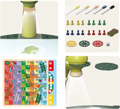 Het tafeltje is licht, compact en draagbaar – ideaal voor de kinderkamer en op reis. De projector is eenvoudig te bedienen en werkt op 3× AA 1,5 V-batterijen (niet inbegrepen). Naast tekenen zijn er 2 bordspellen in de set: Mens erger je niet! en Slangen en Ladders met dobbelsteen en pionnen.
