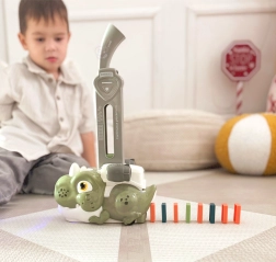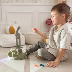 Ontdek de magie van dominobanen met de schattige groene dinosaurus die steentjes in een perfecte rij “uitblaast”. Vul het reservoir, druk op de knop en kijk hoe het speelgoed automatisch domino op de vloer legt. Licht- en geluidseffecten maken het spel nog leuker en motiveren kinderen om verder te experimenteren.