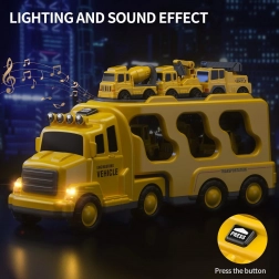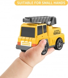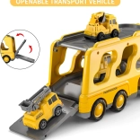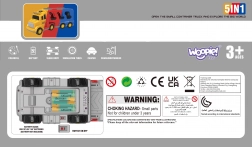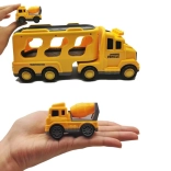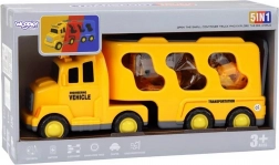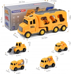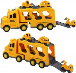 Ontdek de gevarieerde wereld van wegenhulp en bouw met de WOOPIE-set. De grote gele transportcombinatie vervoert en bergt alle kleine voertuigjes op – graafmachine, betonmolen, hijskraan en bulldozer. Dankzij de frictie-aandrijving rijden de kleinere machines na een eenvoudige duw weg; licht en geluid zorgen voor een realistische spelbeleving.