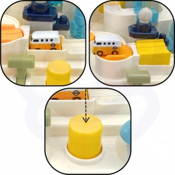 Hendels, knoppen en draaiknoppen brengen de hele baan in beweging. Het kind traint fijne motoriek, coördinatie en concentratie volledig handmatig.