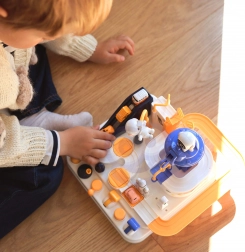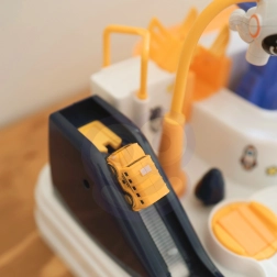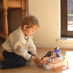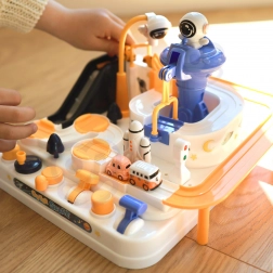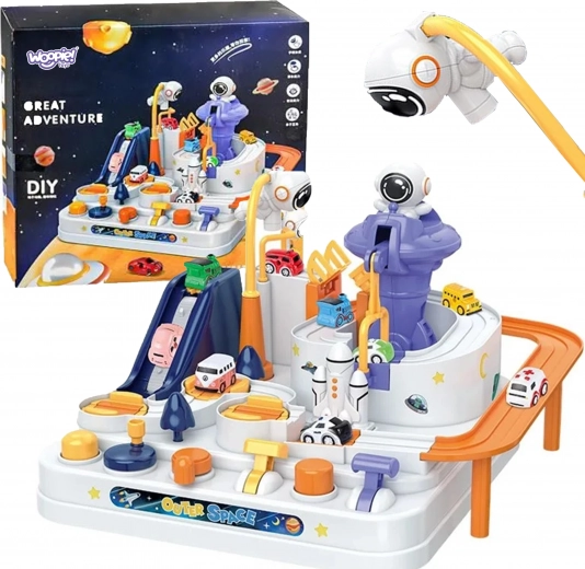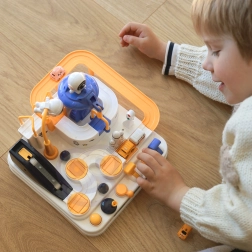 Ontdek de leuke interactieve ruimteracebaan met obstakels, waar kinderen knoppen en hendels bedienen, liften starten, bruggen laten kantelen en met een magnetische raket autootjes verplaatsen. Zonder batterijen, boordevol bewegende elementen, en het stimuleert fijne motoriek, logisch denken en verbeeldingskracht. Inclusief 3 autootjes voor solo spel of wedstrijdjes.