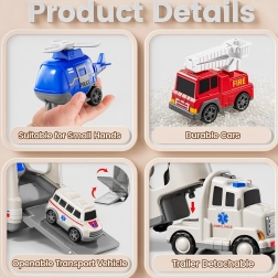 De grote transportwagen biedt plaats aan een brandweerwagen, politieauto, politiehelikopter en ambulance. Ideaal om diverse reddingsscenario’s te oefenen.
