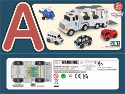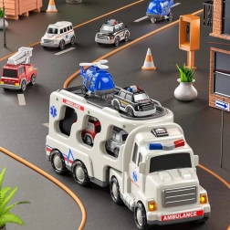transporttrekker (ambulance) + 4 reddingsvoertuigen: brandweerwagen, politieauto, politiehelikopter, ambulance