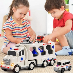 Deze interactieve reddingsset brengt de wereld van echte inzetten tot leven: de grote transportambulance/trekker vervoert en bergt de hele eenheid op – brandweerwagen, politieauto, politiehelikopter en ambulance. Met een druk op de knop boven op de cabine starten en sirene-effecten die het spel nog meeslepender maken.