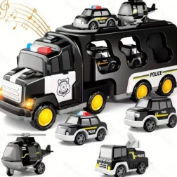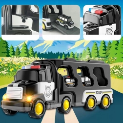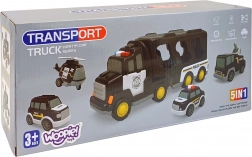 De grote politieset van het merk Woopie biedt 5-in-1 speelplezier: een reuzen-transporttrekker en vier politievoertuigen (pantserwagen, tankwagen met waterkanon, helikopter, radiowagen). Druk gewoon op de knop op de cabine en de knipperlichten en realistische sirenes gaan aan. De robuuste constructie, interactieve effecten en bewegende onderdelen stimuleren de creativiteit en fantasie van kinderen vanaf 3 jaar.