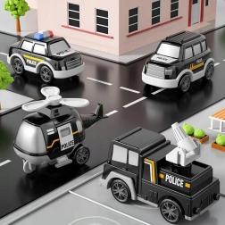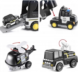 De grote transporttrekker, pantserwagen, tankwagen met waterkanon, helikopter en radiowagen – combineer en creëer je eigen politiemissies.