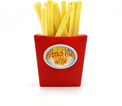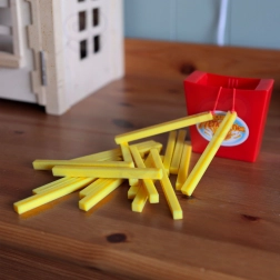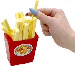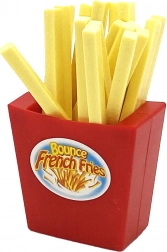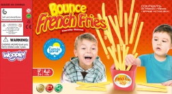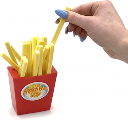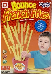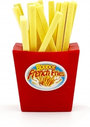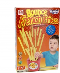 Inhoud van de doos: frietbakje, set frietjes (inclusief twee “verkeerde” frietjes die alles laten opspringen).