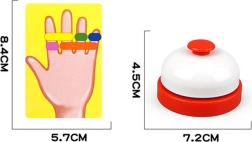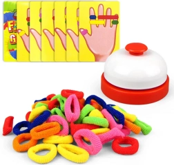 Gekleurde elastiekjes worden om de vingers gedaan volgens de patronen op de kaarten – kinderen oefenen spelenderwijs nauwkeurigheid, behendigheid en oog-handcoördinatie.
