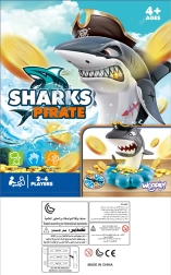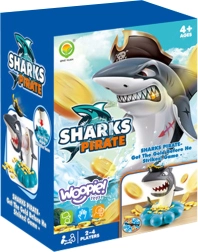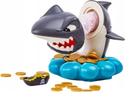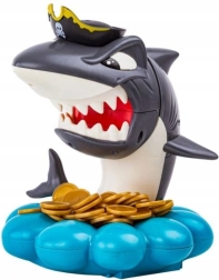 Gooi de goudstukken in de schelpvormige basis, draai aan het rad met pijl en trek precies zoveel munten als je draait. Maar pas op – de haai bewaakt zijn piratenschat en kan elk moment opspringen. Wie de haai laat uitschieten, verliest. Eenvoudige regels, spanning bij elke beurt en boeiende geluidseffecten maken dit een ideale familiegame.