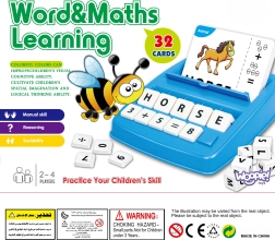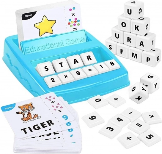 Het spel bevat een blauw plastic blad en witte blokken voor leren door woorden te vormen en wiskundige vergelijkingen te maken.