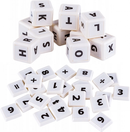 De collectie blokjes en tegels toont letters, cijfers en wiskundige symbolen. De witte plastic dobbelstenen zijn ontworpen voor leren en spelen.