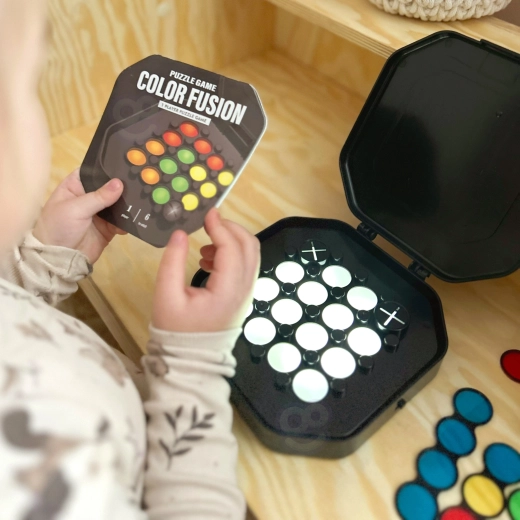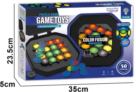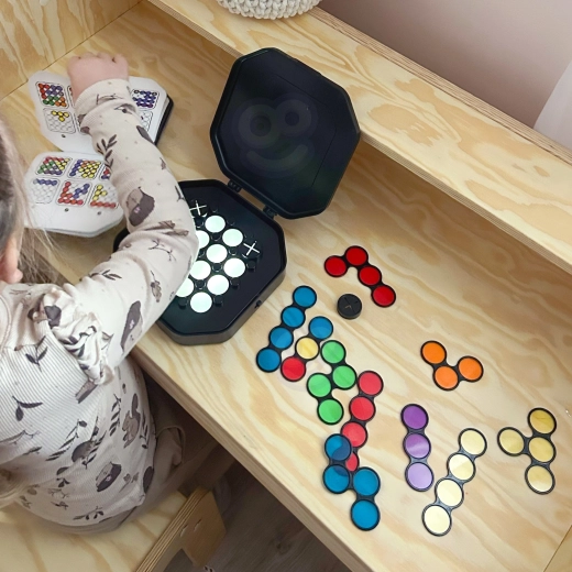 Ontdek een slim ontworpen spel dat logische uitdagingen combineert met kleurrijke creativiteit. Kinderen leggen transparante schijfjes volgens de patroonkaarten en dankzij het verlichte bord zien ze hoe kleuren laag over laag worden gelegd en mengen. Het spel ontwikkelt spelenderwijs ruimtelijk inzicht, oog-handcoördinatie en leert stappen vooruit te plannen.