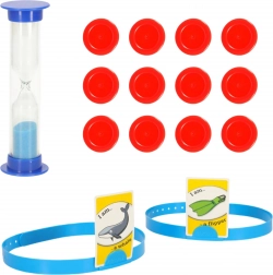 2 hoofdbanden, geïllustreerde kaarten, een zandloper, fiches