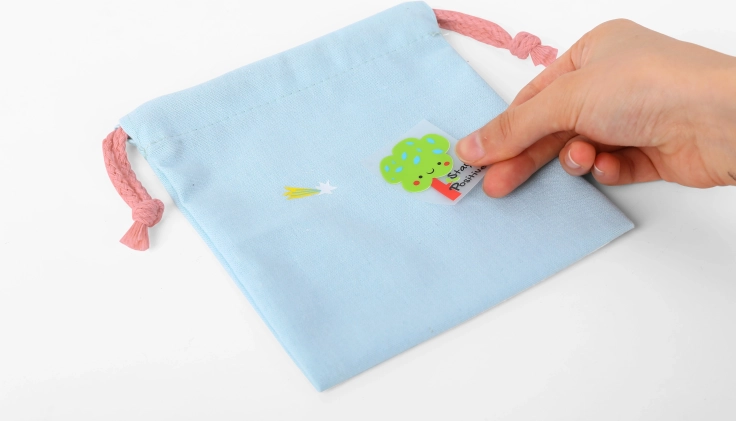 Kleurige letters en cijfers maken het mogelijk het zakje te voorzien van een naam en aan te vullen met vrolijke afbeeldingen – elk stuk wordt uniek.