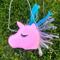 De compacte eenhoorn-handtas verandert na het openen in een mini-beautysalon met spiegeltje en overzichtelijke vakjes voor accessoires.