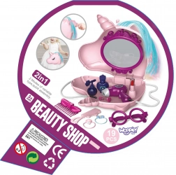 Deze magische set combineert een handtas en kaptafel in één. Na het openen verschijnen een spiegeltje en zorgvuldig geordende accessoires om kapper en make-up te spelen. Kinderen kunnen de kleurrijke eenhoornmanen kammen, zich versieren met ringetjes of brillen en de haren “föhnen” – alles veilig als fantasiespel.