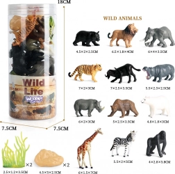• Complete set: 12 figuren van wilde dieren + 2 planten + 2 rotsen (totaal 16 onderdelen)