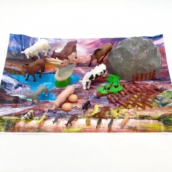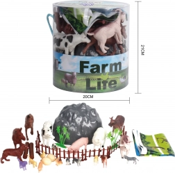 - figuren van boerderijdieren, afrastering, rotsen, planten, speelmat, themakaart, opbergemmer/box