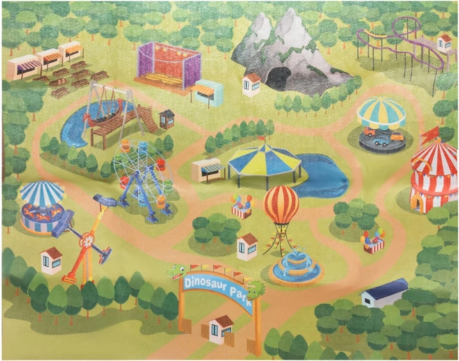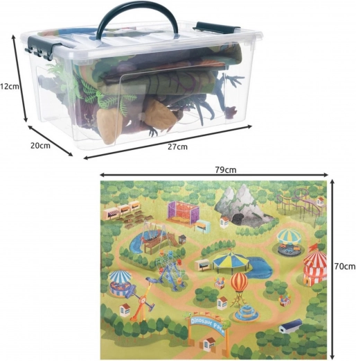 De set bevat een vilten mat met een dinosauruspark-thema, die een overzichtelijke en thematische omgeving voor verhalen creëert.