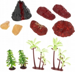 Een gevarieerde set met dinosaurussen, bomen, rotsen en lava maakt het mogelijk om gedetailleerde scènes te bouwen en spelenderwijs de namen van soorten te leren.