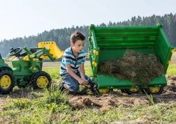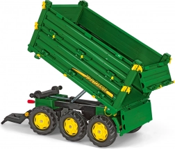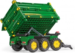 Groene kiepaanhanger van Rolly Toys onder JOHN DEERE-licentie: een robuuste drieassige trailer voor kindertractoren. Biedt driezijdig kippen, stabiele drieassige ophanging en is compatibel met alle Rolly Toys-voertuigen met trekhaak. Gemaakt van hoogwaardige, glanzende kunststof voor eenvoudig onderhoud en een lange levensduur.