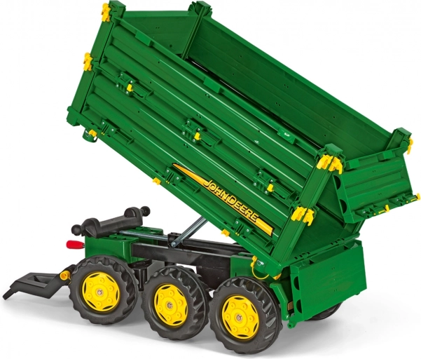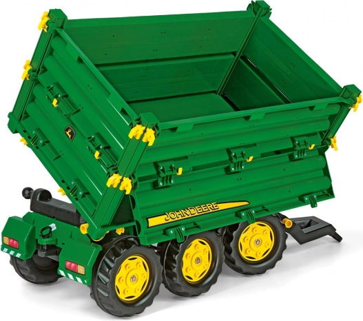 Deze realistische aanhanger in JOHN DEERE-kleuren verandert elke tuin in een kleine boerderij. Dankzij het driezijdig kippen en de te openen zijborden spreekt hij kinderen aan door zijn functionaliteit en vergemakkelijkt hij het laden en lossen van gras, zand of klein materiaal. Het draaibare drukwiel/draaiknop maakt een eenvoudige en veilige bediening van het kiepen mogelijk.