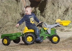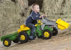 De realistische traptractor in de iconische JOHN DEERE-kleuren stimuleert de verbeelding, motoriek en coördinatie. Dankzij de functionele voorlader kunnen kinderen boer spelen, bladeren of zand laden en kleinigheden vervoeren in de afneembare aanhanger. De te openen motorkap verbergt een praktische opbergbox voor schatten.