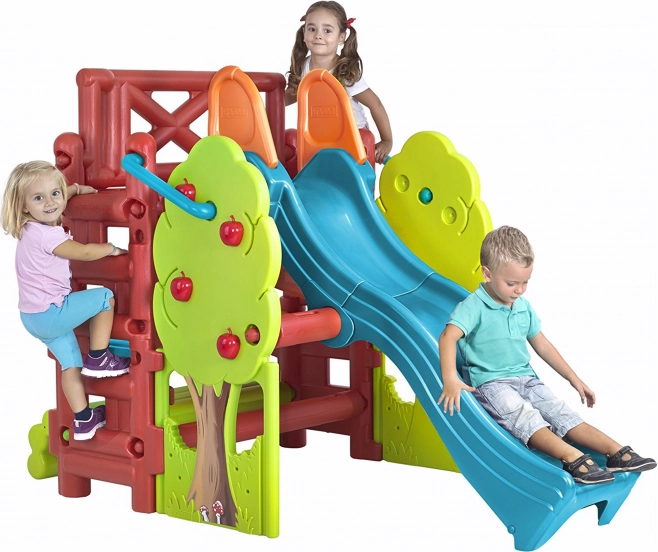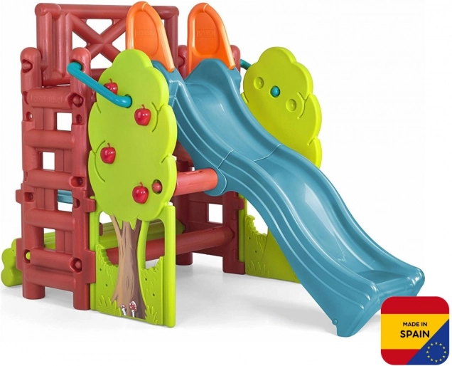 Twee klimwanden leiden naar een platform, vanwaar kinderen via de glijbaan naar beneden gaan. Geweldig voor de ontwikkeling van motoriek en sociale vaardigheden.