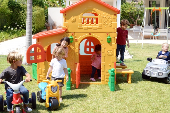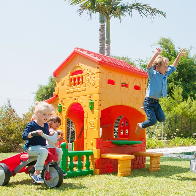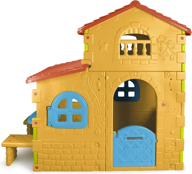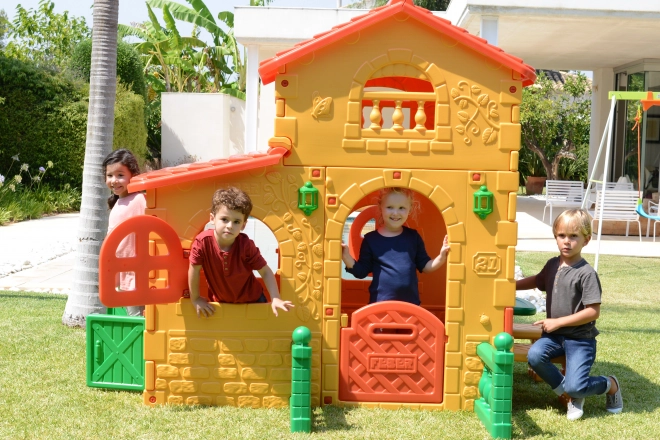 Ontdek het ruime kinderhuis Super Villa van FEBER – een kleurrijk en duurzaam tuinhuis met een grote binnenruimte, een tafeltje en twee bankjes, te openen raampjes en een brievenbus in de deur. Dankzij de Anti-UV-bescherming blijven de kleuren behouden en is het eenvoudig te monteren, ideaal voor kinderen vanaf 3 jaar.